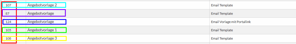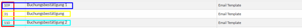 Die jeweilige ID zur E-Mail Vorlage erkennen Sie an der Zahl, welche vor dem Namen der E-Mail- Vorlage steht.