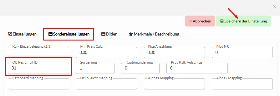 Da es sich hier um den Versand einer Buchungsbestätigung handelt, hinterlegen Sie die jeweilige ID der E-Mail-Vorlage im Feld OB Res Email ID der gewünschten Reservierungsbestätigung.