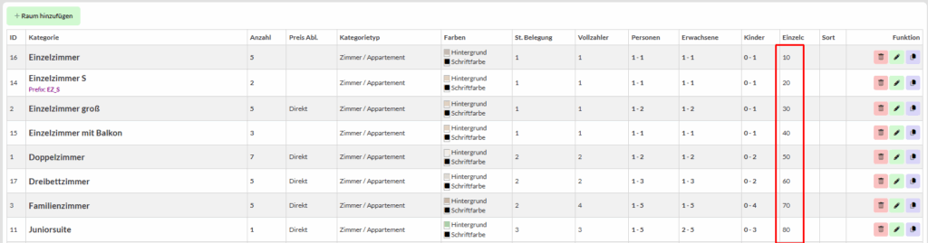 In allen 3 Zimmerkategorien wurde der gleiche Preis hinterlegt, obwohl Sie den Preis nur bei „Einzelzimmer groß“ eingegeben haben.