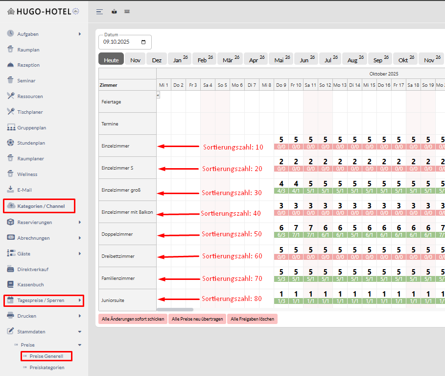 Die Sortierungszahl gibt bei der Kategorie an in welcher Reihenfolgen, von oben nach unten gesehen, Sie die Zimmerkategorien gelistet haben.