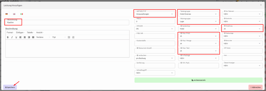 Wenn Sie mit Kautionen arbeiten, legen Sie „Kaution“ als Leistung an und hinterlegen Sie bei der Leistung selbst, dass es bei der Anzahlung verwendet werden darf. Man. Preis, Menge, Text auf JA.