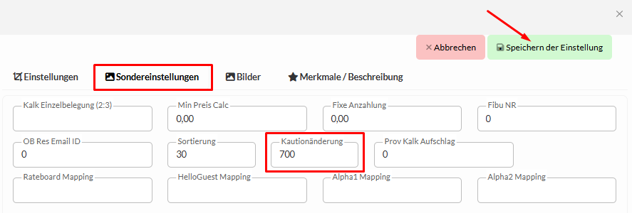 Sollte sich eine Kaution in einer Zimmerkategorie von allen anderen, oder den meisten Kautionen unterscheiden, können Sie in der zutreffenden Zimmerkategorie selbst die Kaution mit Angabe in € ändern.