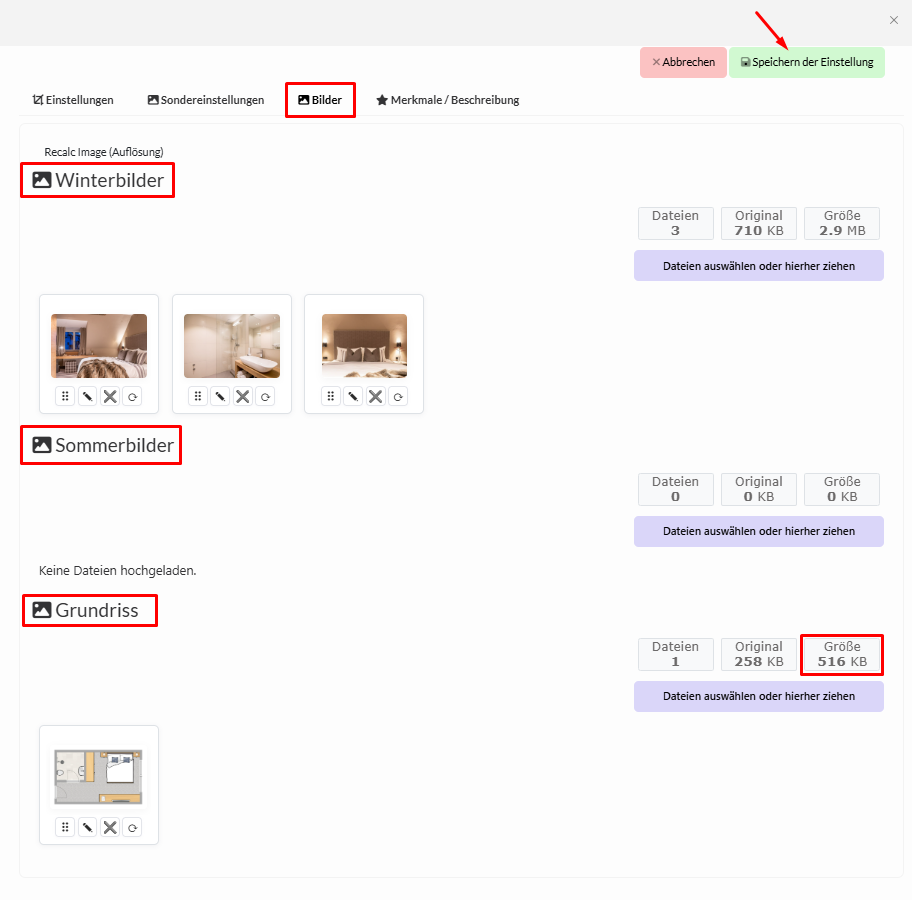 Haben Sie für Sommer und Winter unterschiedliche Bilder Ihrer Zimmerkategorie, dann können Sie die Bilder für Winter bei „Winterbilder“ hochladen und jene für Sommer bei „Sommerbilder.