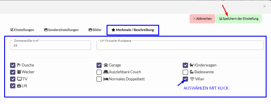 Unter „Merkmale / Beschreibung“ können Sie die Größe der jeweiligen Zimmerkategorie angeben, welche dem Gast in der Online – Buchungsstrecke und dem Portal angezeigt wird.